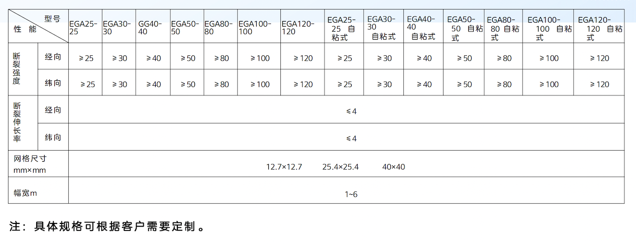 模量高、重量轻、韧性好、耐腐蚀、寿命长,高抗拉强度低延 伸率,无长期蠕变, 物理化学稳定性好,热稳定性好,抗疲劳开 裂,耐高温车辙,抗低温缩裂,延缓减少反 射裂缝。